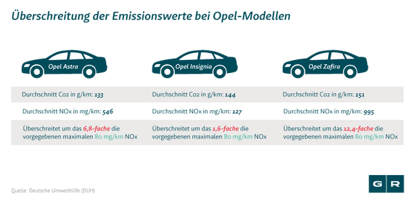 Sowohl das KBA als auch die Deutsche Umwelthilfe (DUH) führten diverse Tests an mehreren Opel-Modellen durch und kamen zu dem Schluss, dass die geprüften Fahrzeuge auf der Straße deutlich höhere Abgaswerte aufwiesen als auf dem Prüfstand. Da liegt die Vermutung nahe, dass auch Opel auf die illegale Zyklus-Erkennung zurückgegriffen hat, um seine Diesel-Fahrzeuge vor der Zulassung deutlich sauberer erscheinen zu lassen.