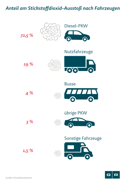 Bei diesen Fahrzeugen werden die nach europäischen Vorgaben zulässigen Stickoxid (NOx)-Grenzwerte um ein Vielfaches überschritten. Diesel-PKW haben in Deutschland bei weitem den höchsten Anteil am Ausstoß des schädlichen Stickoxids, wie auch in der folgenden Grafik deutlich wird.