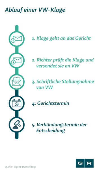 VW wird ab Zustellung der Klage in der Regel circa 6 Wochen Zeit für eine schriftliche Stellungnahme vom Gericht eingeräumt, auf die wir wiederum antworten.