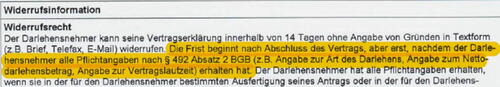Für den juristisch nicht vorgebildeten Verbraucher wird durch den markierten Verweis nicht deutlich, wann die Widerrufsfrist zu laufen beginnt, was die Widerrufsinformation nicht klar und eindeutig verständlich macht. Hierzu ist das Landgericht Saarbrücken (Az: 1 O 164/18) unserem Antrag gefolgt und fragt nun den Europäischen Gerichtshof (EuGH), ob derartige Angaben zum Beginn der Widerrufsfrist mit europäischem Recht in Einklang stehen. Weitere Informationen finden Sie hier: EuGH soll über fehlerhafte Widerrufsbelehrungen entscheiden.
