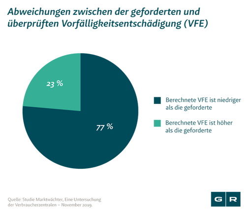 Einer Untersuchung der Verbraucherzentrale Bundesverband 2014 zufolge waren nahezu zwei Drittel der Forderungen der Banken signifikant überhöht. Trotz einer zwischenzeitlichen Rechtsprechung des Bundesgerichtshofs hat sich die Lage auch 2019 nicht wesentlich verbessert. In einer Studie der Marktwächter wurde in 77 % der Fälle eine geringere Vorfälligkeitsentschädigung berechnet als die von der Bank geforderte – und im Durchschnitt war die errechnete Vorfälligkeitsentschädigung 5% geringer als die vom Anbieter geforderte.