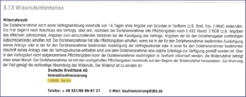 Die Deutsche Kreditbank hat in den meisten Verträgen, die zwischen dem 11. Juni 2010 und dem 12. Juni 2014 abgeschlossen wurden, einen entscheiden Fehler in die Widerrufsbelehrung eingebaut. Denn die Widerrufsinformationen müssen zwingend eine ladungsfähige Adresse enthalten. Gemeint ist hier eine vollständige Anschrift – Straße, Hausnummer, Postleitzahl.