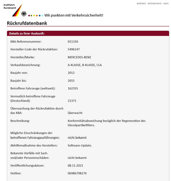 Im Zuge dieser Erkenntnis rief das KBA im November 2021 unter dem Rückrufcode „5496147“ Fahrzeuge von Mercedes-Benz der A- und B-Klasse sowie des CLA-Modells zurück, damit ein Software-Update die CO2-Manipulation „entfernt“. Weitere dienliche Informationen zum Rückruf veröffentlichten weder das KBA noch Mercedes-Benz.