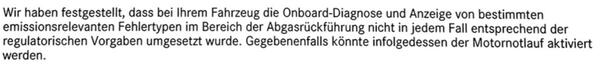 Die Befürchtung liegt nahe, dass aus den Fahrzeugen illegale Abschalteinrichtungen entfernt werden sollen. In dem Schreiben spricht der Konzern nämlich davon, dass die Abgasrückführung nicht „entsprechend der regulatorischen Vorgaben” umgesetzt wurde.