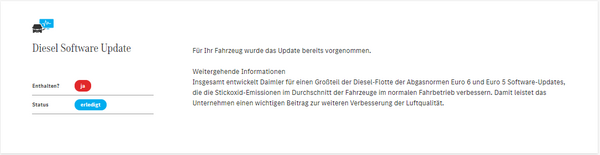 Der zweite Hinweis findet sich auf der Website des Stuttgarter Autobauers. Dort können Kund:innen anhand der Fahrzeug-Identifizierungsnummer (FIN) prüfen, ob für ihr Fahrzeug eine Updateaktion geplant ist. Und überprüft man die FIN-Nummern derer, die einen aktuellen Aufruf zum Software-Update erhalten haben, erhält man die gleichen Angaben wie bei freiwilligen Rückrufen im Abgasskandal bei Mercedes-Benz in der Vergangenheit.