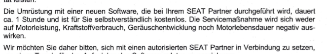 Bis dato raten wir Ihnen dringend dazu, das Update nicht durchführen zu lassen. Viele Betroffene im Abgasskandal berichten davon, dass ein Update zu Folgeschäden am Fahrzeug führte. Auch wenn Autohersteller – wie im Schreiben vom SEAT – das Gegenteil behaupteten. Außerdem werden durch das Update gegebenenfalls Beweise vernichtet, die später in einem Rechtsstreit dienlich sind.