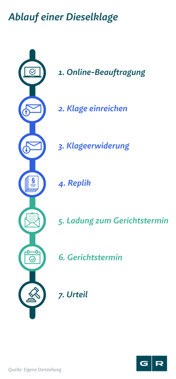 Als Nächstes folgt die erste Amtshandlung des Richters bzw. der Richterin. Dabei wird die Klage geprüft und anschließend der Beklagten, VW, zugestellt. Diese hat nun 6 bis 12 Wochen Zeit für eine schriftliche Stellungnahme.