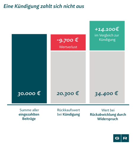 Dazu eine Musterrechnung: Trotz eingezahlter Beiträge von 30.000 € hätte der Versicherungsnehmer nur einen Rückkaufswert von 20.300 € bei einer Kündigung erhalten. Mit der Rückabwicklung durch Widerspruch wurden es 34.400 € – ein Unterschied von sagenhaften 14.100 €!